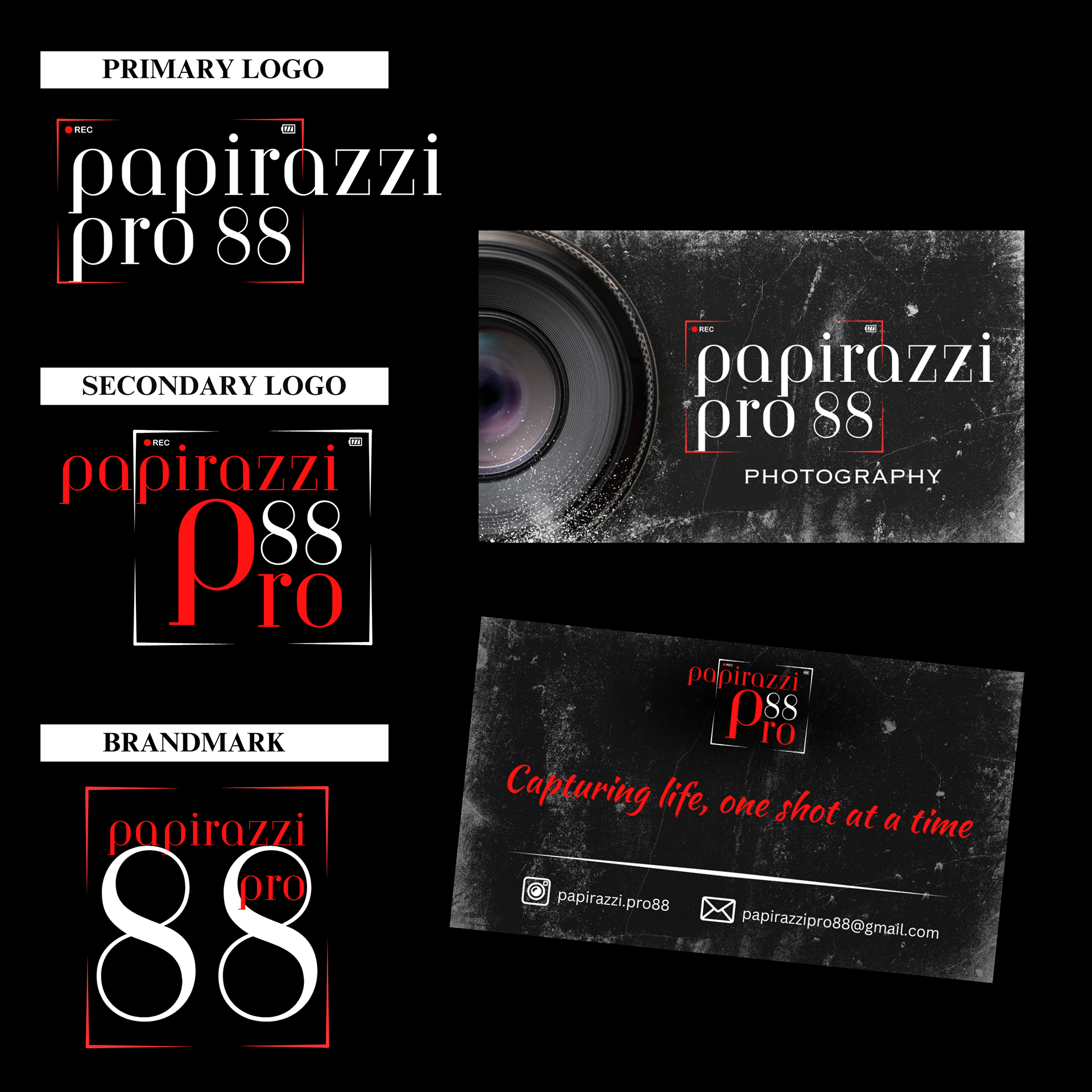 For Paparazzi Pro 88, I took the approach of aligning his brand identity with his lifestyle —one defined by travel, sophistication, and a sense of luxury. I believed that reflecting these qualities through the design would create a strong visual persona that not only appealed to him but also elevated the overall perception of his brand. Using a bold palette of red, white, and black, the visuals were designed to feel grown, mature, and strikingly modern. These colors, paired with sleek typography and refined layout choices, reinforced a high-end aesthetic that positioned Paparazzi Pro 88 as a brand of exclusivity and sophistication.